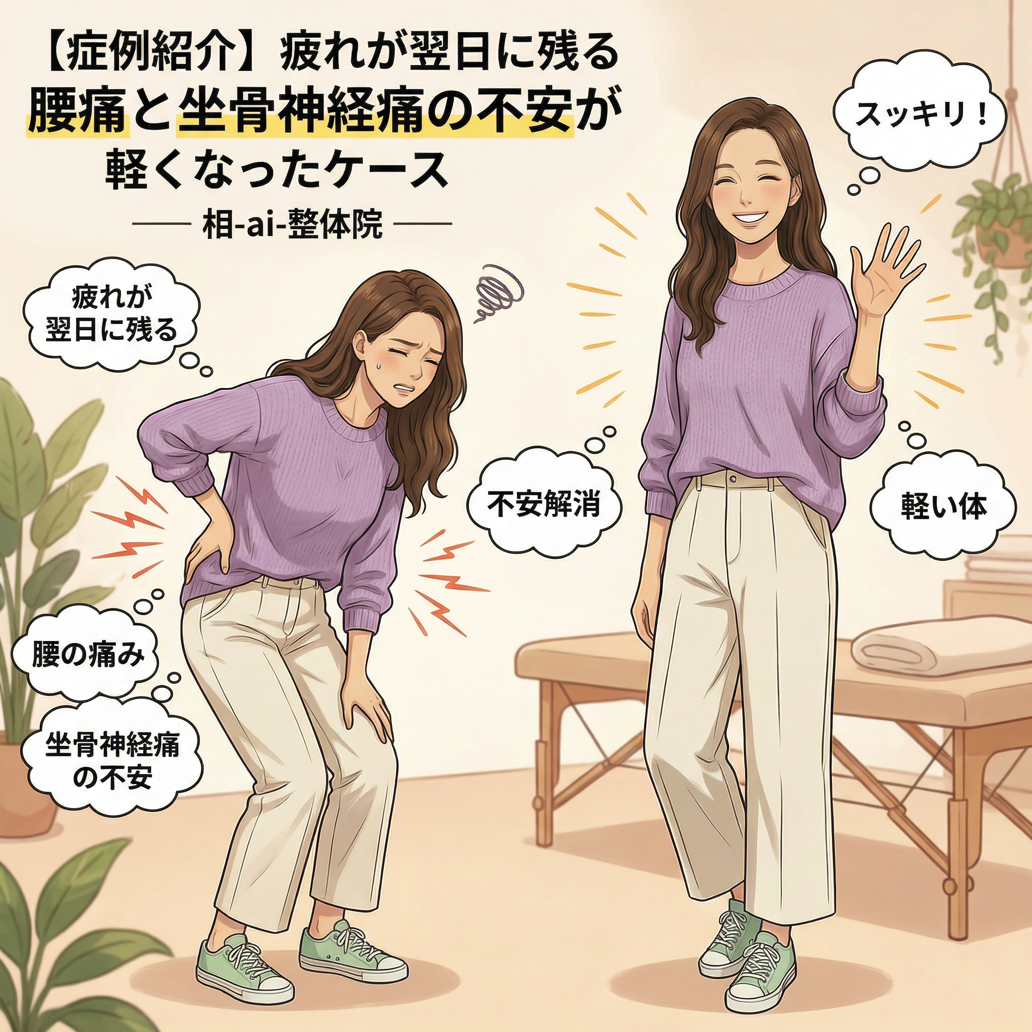 疲れが翌日に残る、腰の痛みが慢性化する、坐骨神経痛が出る――