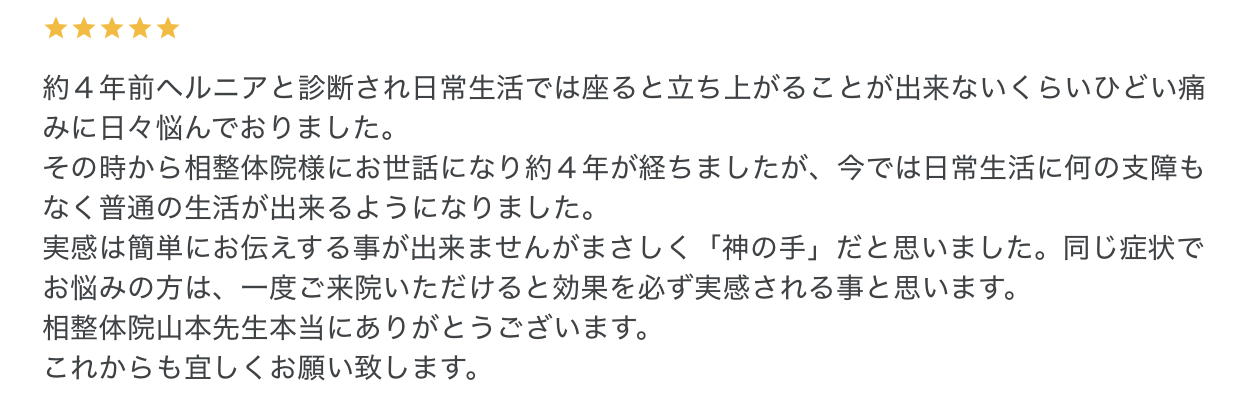 今回ご紹介するのは、約4年前に腰椎椎間板ヘルニアと診断され、強い腰痛と日常生活への支障に悩まれていたお客様の口コミです。